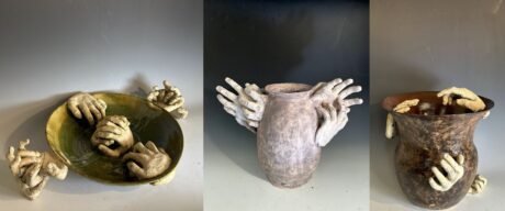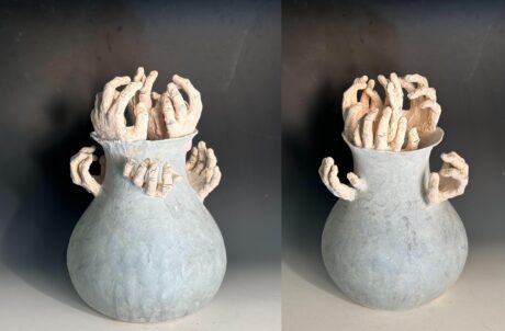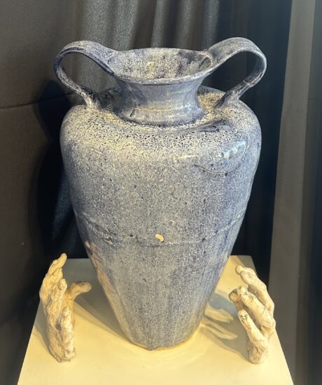 This year, after creative deliberation, Grumdahl Moskowitz decided that her sustained investigation in AP Art would revolve around touch. Explaining this, Grumdahl Moskowitz stated that, “My investigation seeks a way to express the role of touch and hands in the creation of all art.” She added, “I’m fascinated by the way artists’ hands in finished work are typically invisible. Can touch be rendered visible?” Grumdahl Moskowitz first explored this query through ancient forms, specifically amphorae, the classic Greek and Roman jars with narrow necks and handles. Added to this first piece—a large blue amphora—were hand-built ceramic hands with different gestures. Throughout the year, Grumdahl Moskowitz tested her limits through these ceramic hands in different vessels. When reflecting on this, she claimed that she “experimentally increased the number of hands, the complexity of position in relation to the vessel, and the intricacy of gesture to show how my hands are intertwined with those of all artists.” The intricacy of Grumdahl Moskowitz’s work cannot be understated; to create is to touch the canvas, no matter what medium. When adding ceramic hands, made by her hands, to a vessel completely formed by her own hands, Grumdahl Moskowitz is demonstrating a profound example of self-referentialism in art.