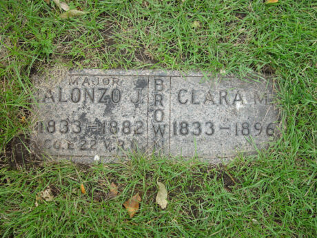 He died at home on December 11, 1882. He is buried next to his wife, Clara, and currently has two markers. One is a worn military marker, placed in 1888. The other is a marker that he shares with Clara. Although the family marker refers to him as “Major” Brown, that is not correct; his highest rank was Captain. His military marker is due to be replaced in the near future.