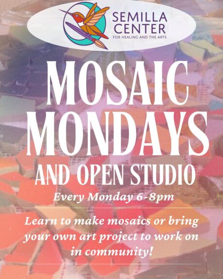 Does non-directed community creativity bring you joy, strength, relief – or any other soul-lifting benefit? Then you should know about Semilla Open Studio Mondays. This weekly open studio welcomes everyone to work in community company on mosaics or linocut prints (materials and basic instruction provided) or on a personal project from home. Check the Semilla Center facebook page for details and occasional schedule changes for the upcoming week!