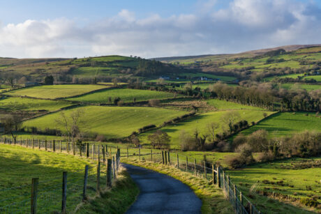 A serene country road winds through the rolling hills and green fields of the Glens of Antrim, dotted with farms and sheep grazing peacefully. IMAGE: Adobe Stock